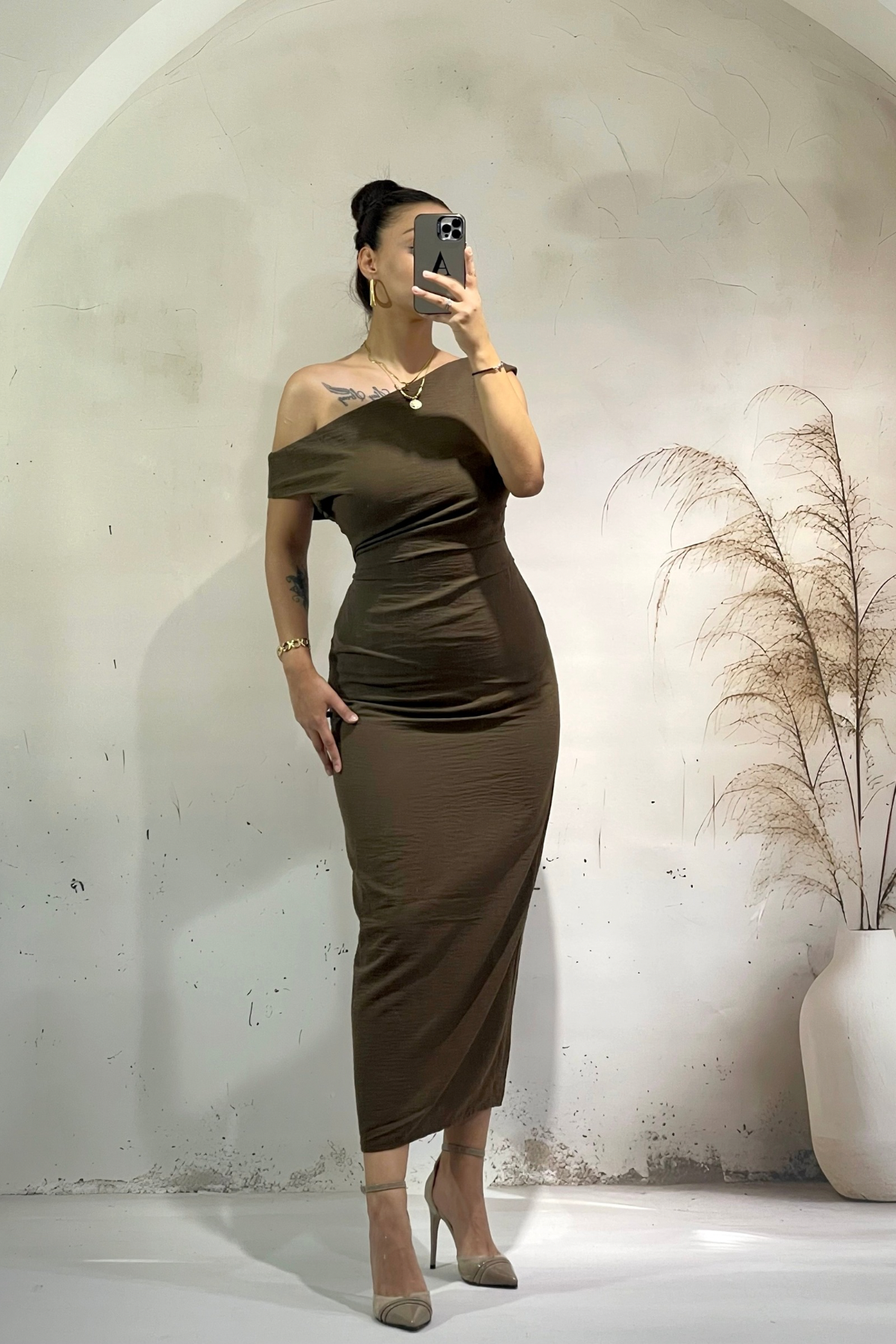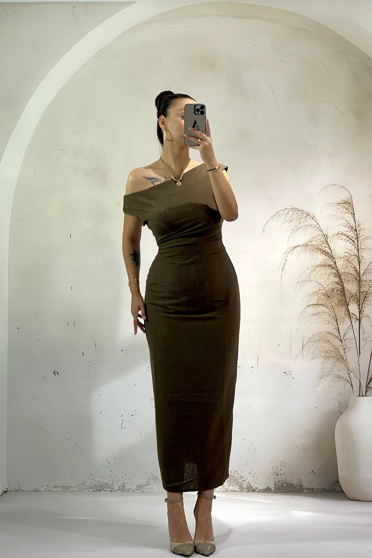 Acı Kahve Arkadan Yırtmaçlı Midi Boy Elbise
