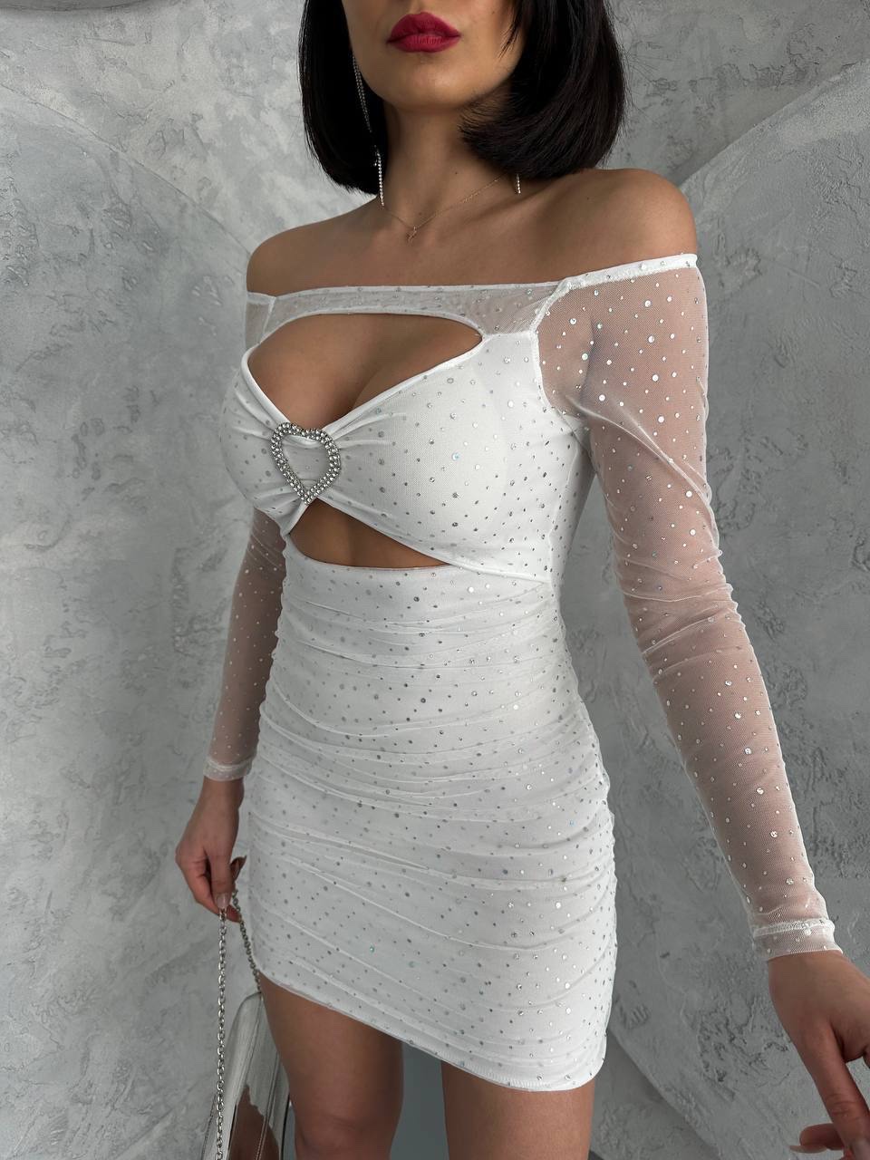 Beyaz Pullu Dekolteli Mini Elbise