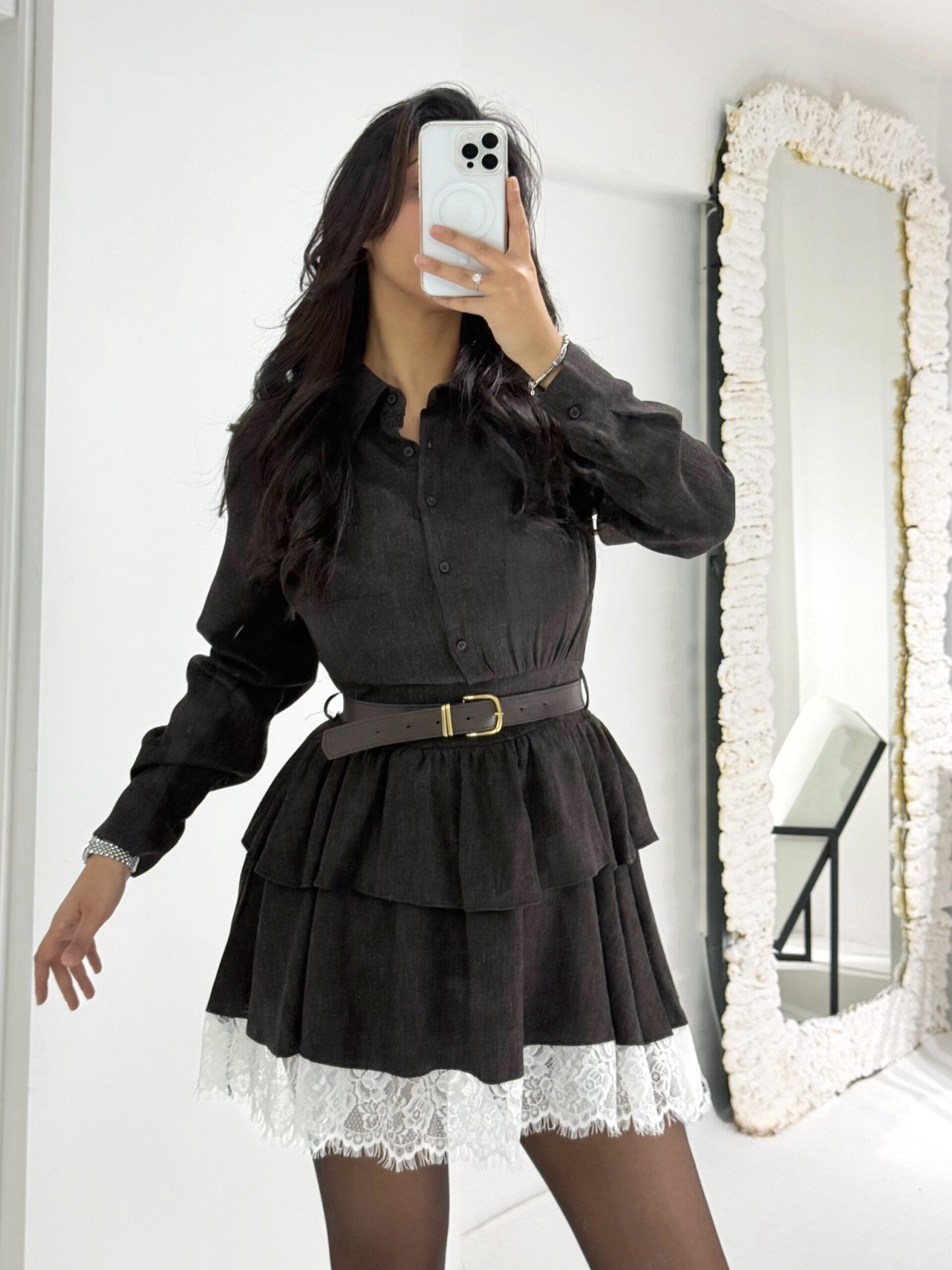 Siyah Dantel Detaylı Kemerli Mini Elbise