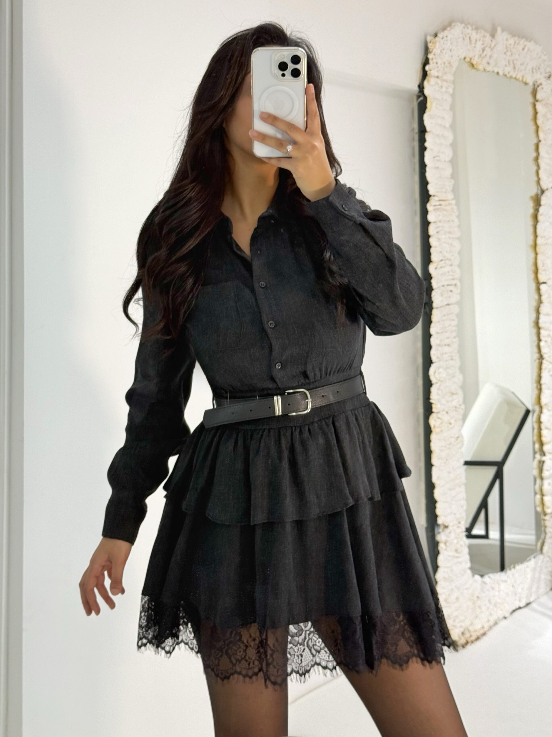 Siyah Dantel Detaylı Kemerli Mini Elbise