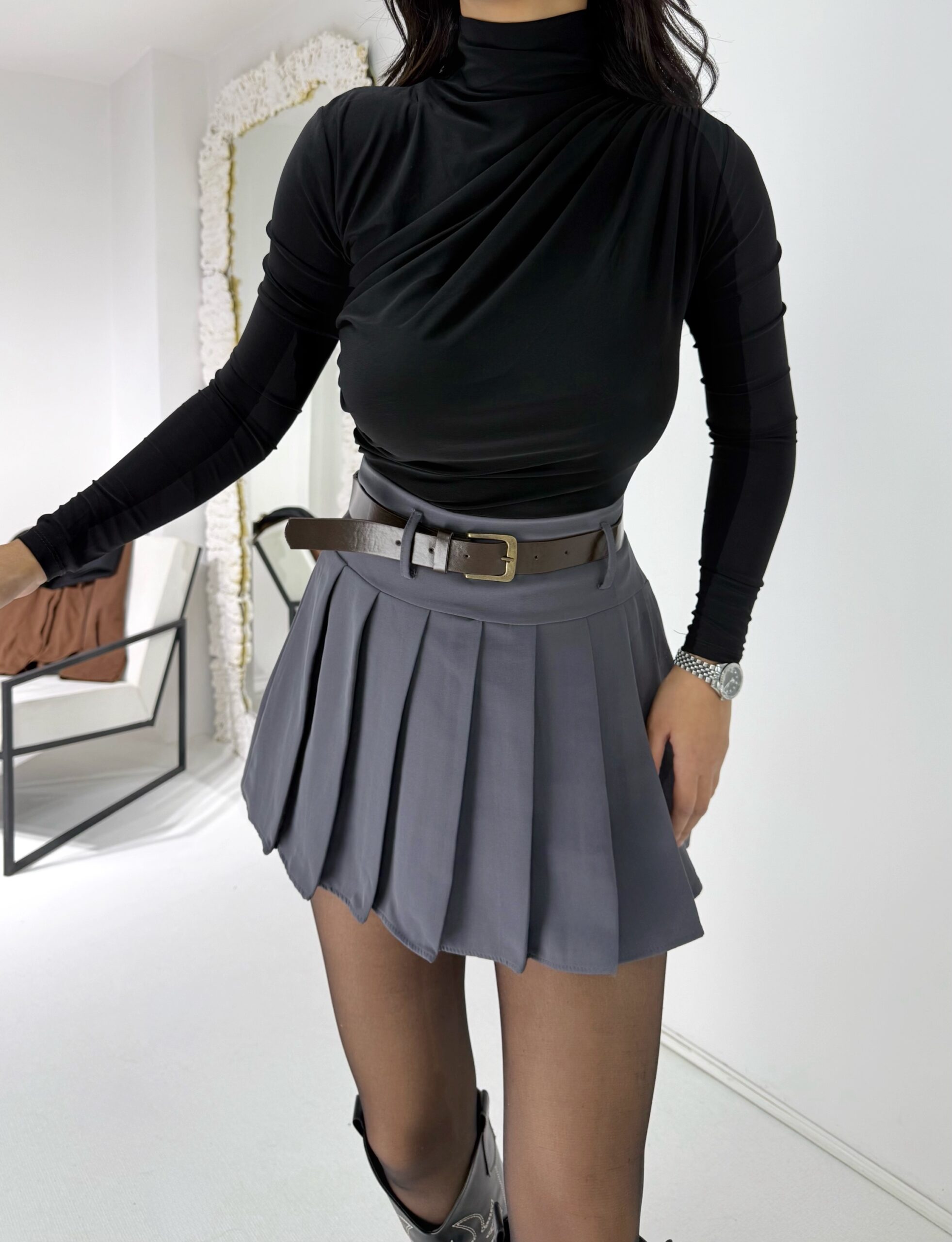 Gri Kemerli Pileli Şort Etek