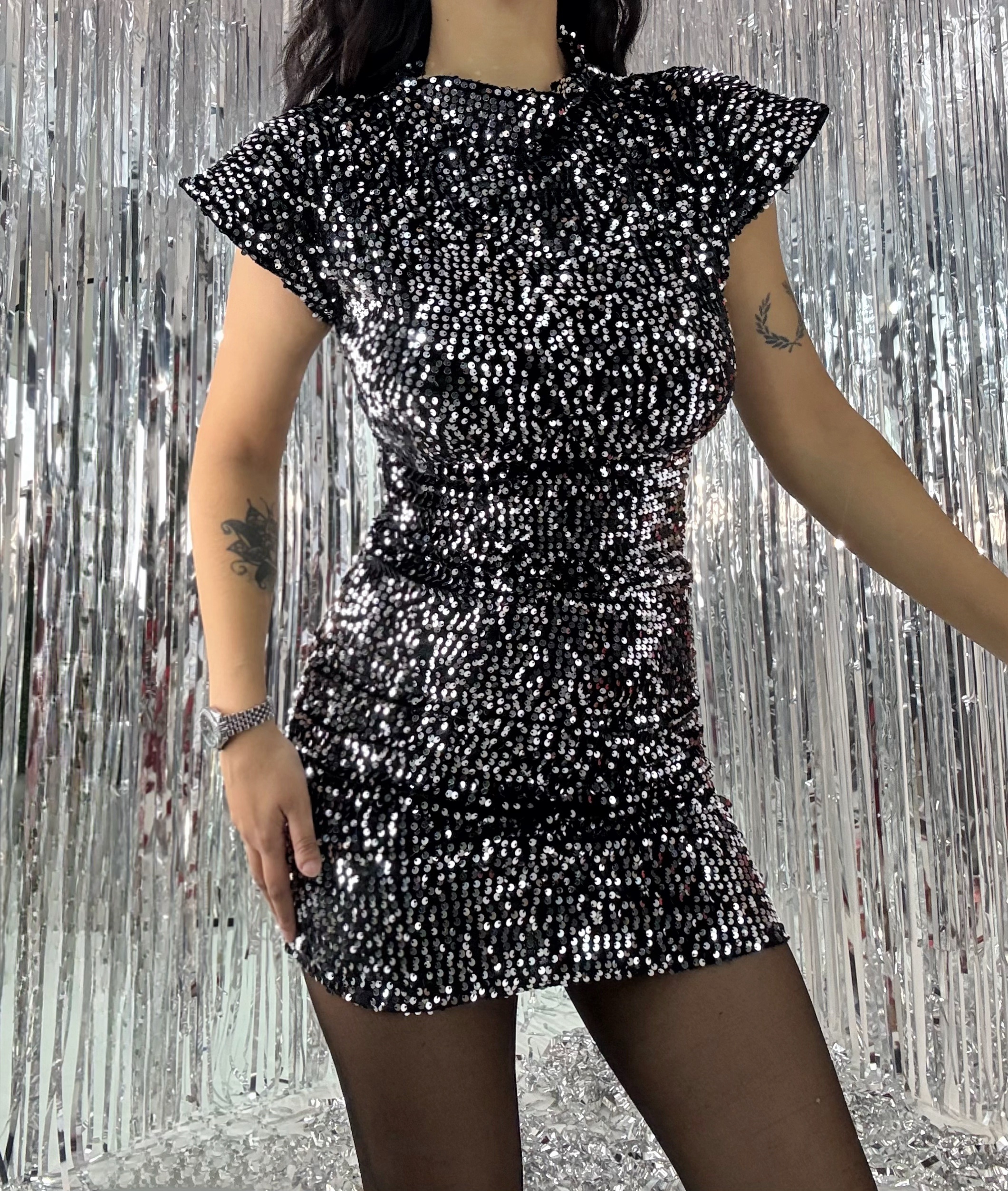Siyah Gümüş Pul Payet Vatkalı Mini Elbise